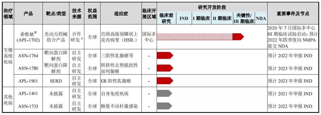 4. APL-1901:用于治疗雌激素受体阳性的乳腺癌,目前全球唯一一个已上市的 SERD 药物是由阿斯利康开发的氟维司群(fulvestrant),仅能通过注射方式给药,存在注射部位疼痛或过敏、患者依从性差等问题。由于其口服生物利用度低,目前全球尚无口服剂型上市,预计将于 2023 年提交 IND。