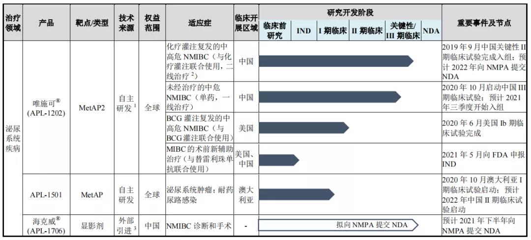 - 2020 APL-1702国际多中心三期临床试验启动注册临床研究;提交APL-1202用于一线治疗非浸润性膀胱癌的注册临床申请、APL-1501在澳获批开展I期临床试验。