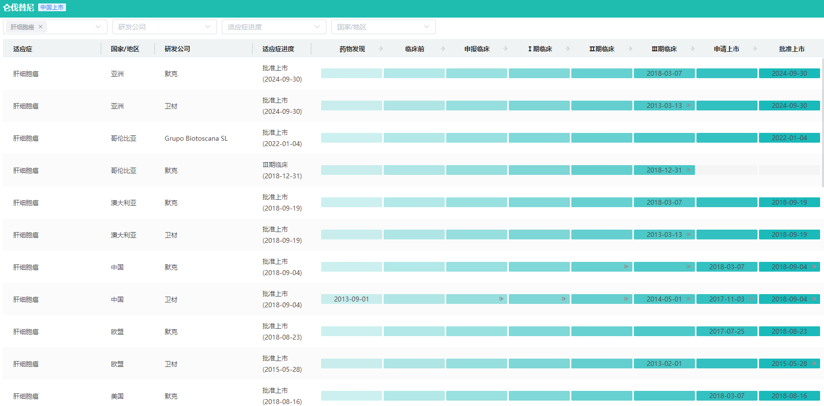 仑伐替尼肝细胞癌全球研发进度查询(部分)