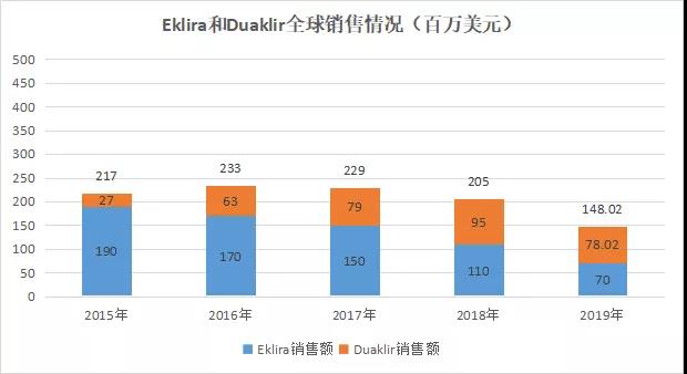 据药融云数据,Eklira和Duaklir自2015年至2019年累计创造了10.32亿美元的收入,不过近年来这两款产品每年的总销售额出现下滑。