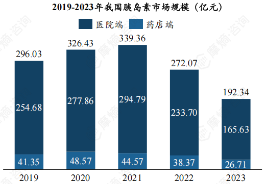 近年来,受集采政策的显著影响,我国胰岛素市场规模发生了明显变化。据摩熵医药数据库的数据显示,近五年我国胰岛素市场规模走势呈现出先升后降的态势。2019年市场规模为296亿元,随后增长至2021年的峰值339亿元。然而,由于2021年全国第六批集采(胰岛素专项集采)的实施,市场规模迅速下滑,到2023年已降至192亿元。其中,医院端的销售额为166亿元,约占总销售额的86%。