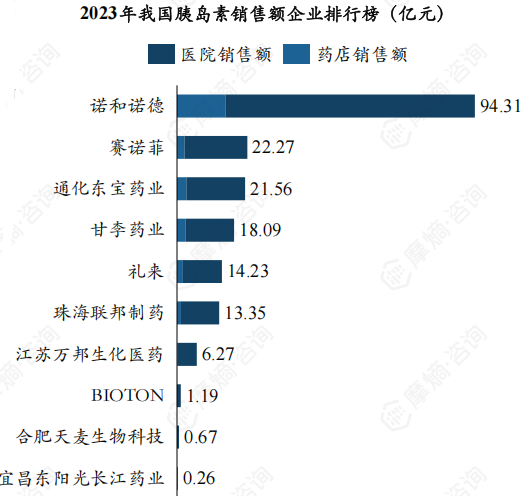 从企业竞争层面来看,在2023年我国胰岛素销售额企业排行榜中,排名前五的企业外资占据三席,内资占据两席。外资企业中,诺和诺德以94.31亿元的销售额位居榜首;赛诺菲销售额约为22.27亿元,礼来销售额约为14.23亿元。在内资企业中,通化东宝和甘李药业被誉为国产胰岛素双雄,2023年销售额分别约为21.56亿元和18.09亿元。