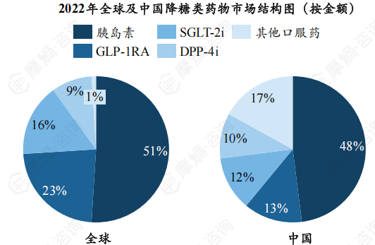 在全球及中国降糖药物市场的大格局中,胰岛素依旧占据着半壁江山。我国胰岛素市场份额占比约为48%,紧随其后的是GLP-1RA(13%)、SGLT-2i(12%)、DPP-4i(10%)以及其他口服降糖药(17%)。