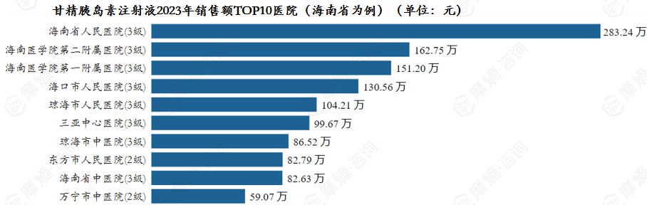 甘精胰岛素注射液2023年销售额TOP3医院(海南省为例)分别为海南省人民医院、海南医学院第二附属医院、海南医学院第一附属医院。