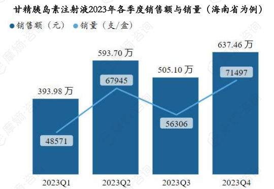 据摩熵医药药物流向数据显示,以海南省为例,甘精胰岛素注射液2023年各季度销售量和销售额如下图: