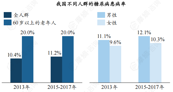 我国糖尿病患者人数超1.4亿人,老年人患病率高,男性患病率整体高于女性。