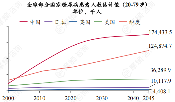 根据国际糖尿病联盟发布的《全球糖尿病地图(第10版)》,目前全球有5.37亿糖尿病患者,约占全球人口的10.5%,预计到2030年全球糖尿病患者数量将增长到6.43亿人,增长20%,到2045年将达到7.83亿人,增长46%。中国20-79岁成年人中,糖尿病患者人数为1.41亿人,全球排名第一,约占全球糖尿病总人数的1/4,到2045年,将增长到1.74亿人。