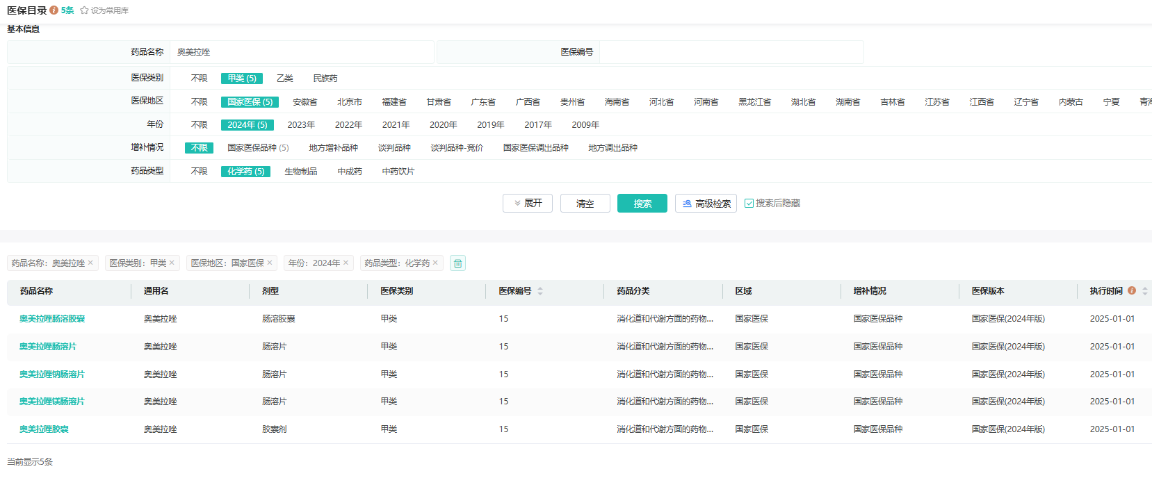 药品医保类别、医保编号、执行区域等详细信息,可通过摩熵医药数据库(医保目录数据库)进行快速查询。