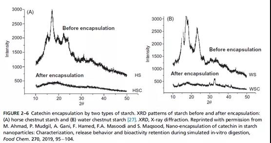最近,Ahmad等人利用DSC和XRD来考察淀粉包封儿茶素的包封效果。他们将儿茶素包封在不同类型的淀粉纳米颗粒中。他们观察到,经过纳米包封过程后,包封体系的结晶度降低,形成非晶态纳米颗粒(图2-6)。晶体性质的降低归因于晶体结构长程有序的破坏。