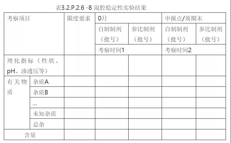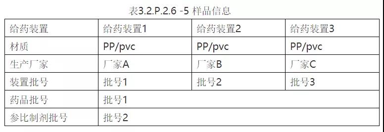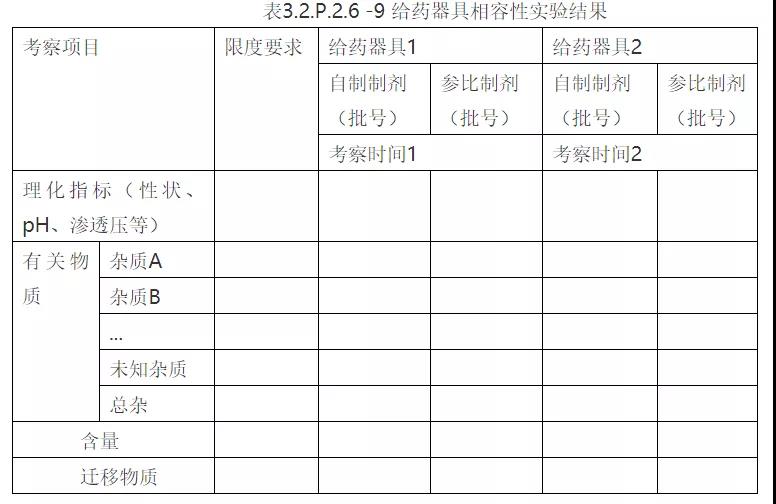 备注:①表中数据根据实验结果填写,考察项目可适当增减;②迁移物质这部分还应说明迁移量是否低于内控限度,通过最大日剂量计算各迁移物质的最大日摄入量,最大摄入量是否小于该迁移物每日最大暴露量(PDE),安全系数是否小于1%,从而证明给药器具相容性安全,且风险可控。同时迁移物质分析方法验证也应在该部分提交。