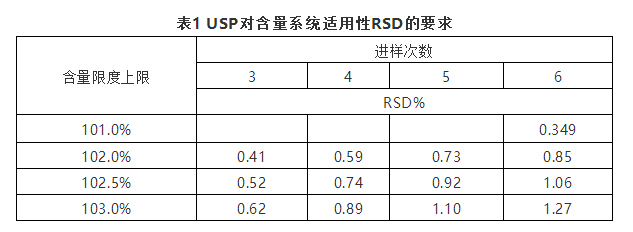 美国药典并没有明确对分离度、理论塔板数、拖尾因子、重复性及灵敏度的统一要求,在药典正文中各个品种项下分别规定。当采用标准品或标准品溶液需要重复进样以判断系统的精密度,除非个论中有规定,系统适用性5针的数据的相对标准偏差不得超过2.0%,当超过2.0%时,需要计算连续6针进样的数据。在含量测定中,系统适用性的相对标准偏差与进样次数和含量限度上限有关,表1是USP对含量系统适用性测试相对标准偏差的规定。