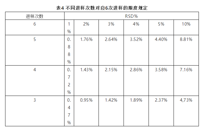 日本药典要求在液相中的系统适用性一般重复进样6次,需要根据实际情况确定适合的相对标准偏差。比如6次进样的相对标准偏差不大于1.0%,则要求杂质含量不得大于5.0%,含量应在98.0%~102.0%范围内。杂质含量在0.5%~1.0%范围内,则要求系统适用性的相对标准偏差不大于2.0%。不过,在利用梯度方法或者样品包含强保留组分时,可以适当减少进样次数来确定新的接受限度以满足系统适用性,表4是不同进样次数对应6次进样的限度规定。