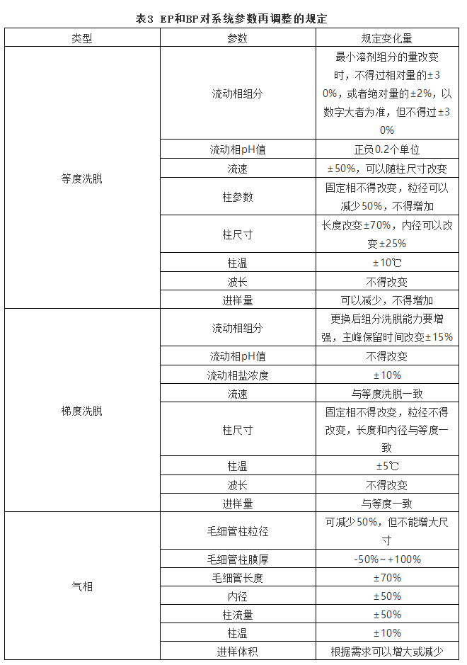 欧洲药典和英国药典对系统适用性要求也做了非常详细的规定,并且对保留时间、保留体积、死体积、死时间等概念做了详细描述。EP和BP关于对称因子规定参考笔者撰写《拖尾因子、对称因子和不对称因子区别理论》,在此不做赘述。系统适用性5针的数据的相对标准偏差与USP规定基本一致。当系统适用性不符合要求时可以适当调整方法参数,EP和BP对等度洗脱和梯度洗脱分别做了规定,详见表3。