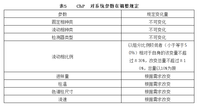中国药典要求定量分析时,分离度应大于1.5。进行重复性分析,采用外标法时,取对照品溶液连续进样5次,峰面积相对标准偏差不大于2.0%,采用内标法时,配制80%、100%和120%对照品溶液,加入规定量的内标溶液,配成3种不同浓度的溶液,分别至少进样2次,计算平均校正因子,其相对标准偏差不大于2.0%。拖尾因子规定参考笔者撰写《拖尾因子、对称因子和不对称因子区别理论》,在此不做赘述。当系统适用性不符合要求时可以适当调整方法参数,ChP同样对参数改变做了要求。表5是ChP对系统参数在调整规定。