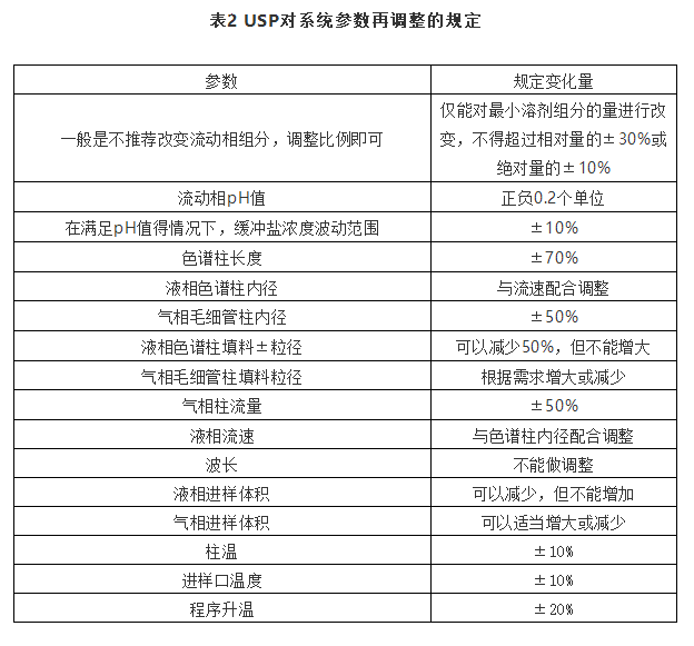 关于对称因子规定参考笔者撰写《拖尾因子、对称因子和不对称因子区别理论》,在此不做赘述。当系统适用性不符合要求时可以适当调整方法参数,不过每个变量的最大值都应该进行验证其系统适用性,对改变后的方法进行重新评价。表2是USP对参数调整的规定。
