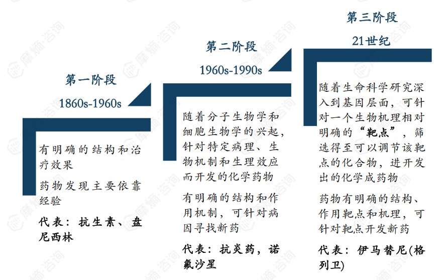 小分子药物的发展历史可分为化合物时代、分子生物学时代、靶向药物时代三个阶段,具体来说: