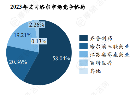 根据摩熵医药数据库,2015-2023年艾司洛尔全国销售额一路攀升,2022年首次突破十亿元,2023年达12.27亿元,年复合增长率达19.15%。齐鲁制药占据58.04%的市场份额,哈尔滨三联药业、江苏奥赛康药业排名第二、三位,市场份额分别为20.36%、19.21%。