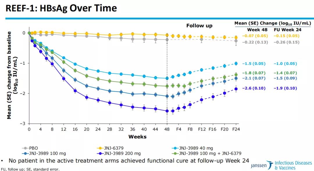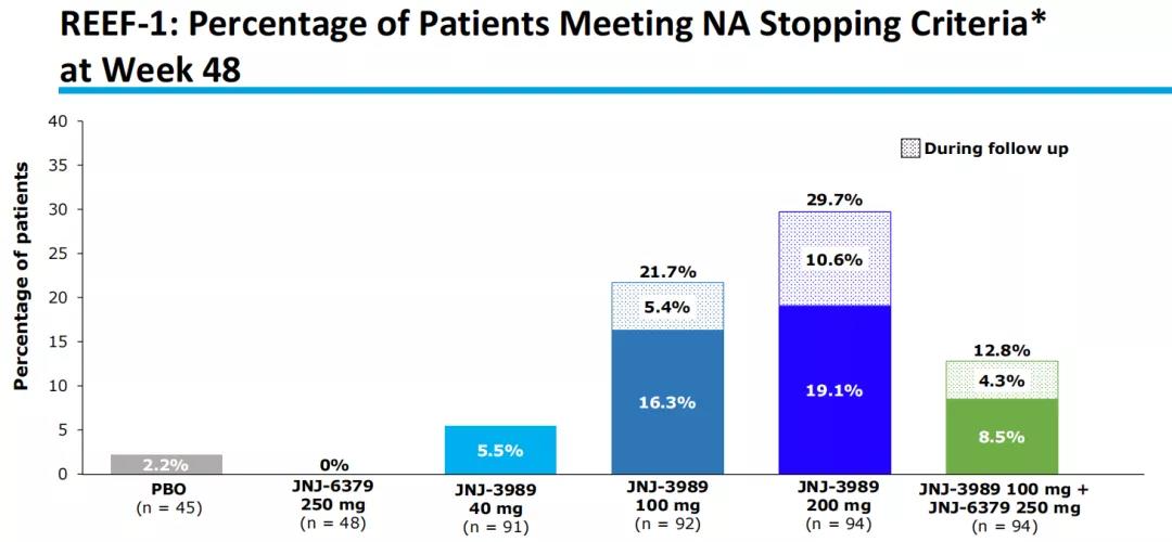 2019年8月,杨森开启了一项名为REEF-1的多中心、随机双盲、阳性对照的2b期研究(NCT03982186),该研究旨在建立JNJ-73763989+核苷(酸)类似物(NA)的抗病毒活性的剂量-反应关系,并评估JNJ-73763989+ NA(±JNJ-56136379)和JNJ-56136379+ NA联合疗法治疗慢性乙肝的疗效,该研究招募470例慢性乙肝患者,研究主要终点是观察第48周时满足NA停药标准(ALT<3x ULN、HBVDNA <LLOQ、HBeAg阴性[<LLOQ]和HBsAg<10 IU/mL)的患者比例。