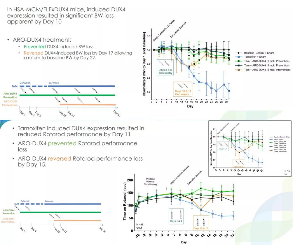 2021年6月,Arrowhead在第28届FSHD学会国际研究大会上披露了ARO-DUX4的临床前研究数据。在小鼠体内静脉注射3mg/kg剂量的ARO-DUX4,实现药物递送至76-99%的腓肠肌肌纤维中;非人类灵长类动物接受10mg/kg剂量3次给药(day1, 7,28),实现血清肌肉生长抑制素(myostatin)水平减少79%,到第12周仍观察到70%以上的减少。ARO-DUX4还实现了DUX4的剂量依赖性敲低,在FSHD样转基因小鼠模型中,ARO-DUX4预防并逆转了DUX4靶基因的过表达;防止DUX4引起的体重丧失;在第17天逆转了DUX4引起的体重下降,在第22天恢复到基线体重;预防并逆转了肌肉纤维化,改善了小鼠在旋转棒疲劳试验中的表现。