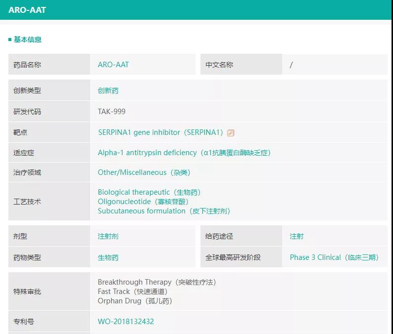ARO-AAT(也称TAK-999)是Arrowhead开发的第二代皮下给药RNAi疗法,用于治疗α-1抗胰蛋白酶缺乏症(AATD)相关肝病。AATD是一种罕见的常染色体显性遗传病,该病严重损害患者的肝脏和肺部,据估计,在欧洲大约2500人中有1人受该病影响,在美国约3000~5000人中有1人受该病影响。