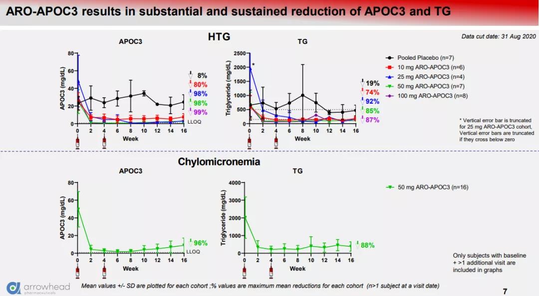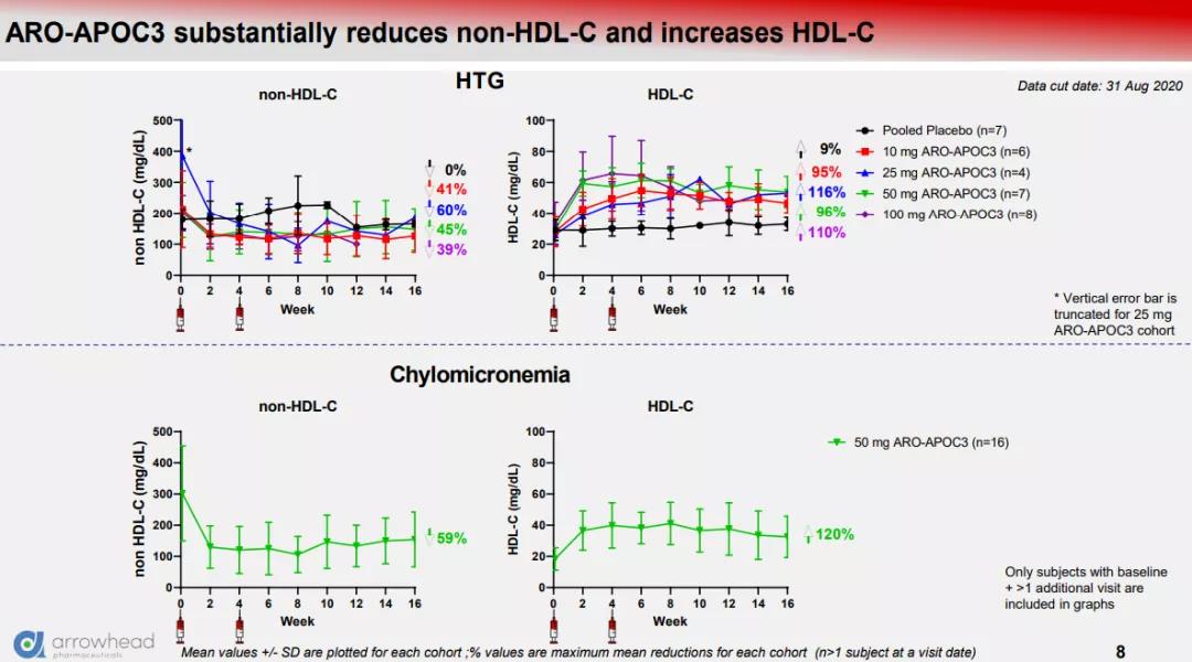 2020年11月,公司在2020美国心脏协会科学年会(AHA2020)上披露了ARO-APOC3在高甘油三酯血症(HTG)以及乳糜微粒血症患者中的临床研究数据(数据截取至2020年8月31日)。数据显示,ARO-APOC3可显著且持续降低ApoC-III以及甘油三酯(TG)水平,在HTG患者中可将甘油三酯水平降低74%~92%;显著降低非高密度脂蛋白胆固醇(non-HDL-C)水平,提高高密度脂蛋白胆固醇(HDL-C)水平。
