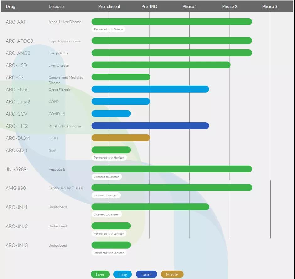 针对肝脏,除上述候选疗法之外,公司根据与杨森公司达成的协议,正在为杨森开展ARO-JNJ1、ARO-JNJ2和ARO-JNJ3的药物发现、优化、临床前研究与开发工作,具体靶点与适应症未披露。