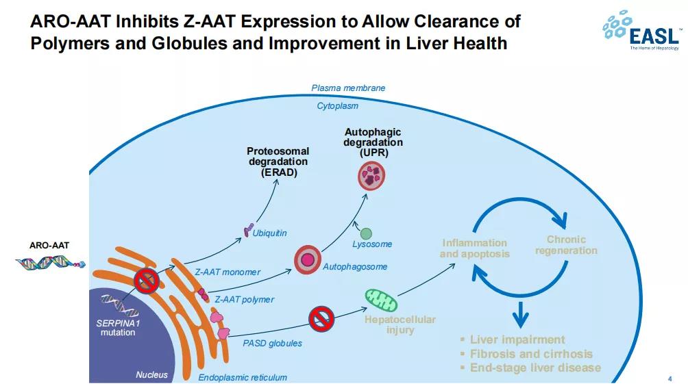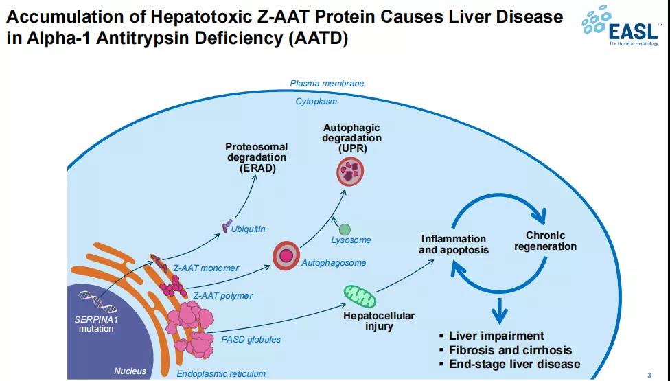 α1-抗胰蛋白酶(AAT)是一种由肝细胞合成的重要蛋白质,其功能是抑制那些能够分解正常结缔组织的蛋白酶,以维持组织细胞完整性。AATD正是由于编码AAT的SERPINA1基因发生突变,使体内正常AAT浓度下降而导致。最常见的疾病变体是Z突变,该变体会导致单个氨基酸被替代,引起蛋白质的错折叠,无法有效分泌并在肝细胞内堆积,继而引发持续的肝细胞损伤。纯合PiZZ基因型的个体严重缺乏功能性AAT,导致肺部和肝脏疾病。肺部疾病常用AAT增强疗法,但针对肝脏疾病并无特定疗法,只能依靠肝脏移植,因此该领域存在大量未满足的需求。