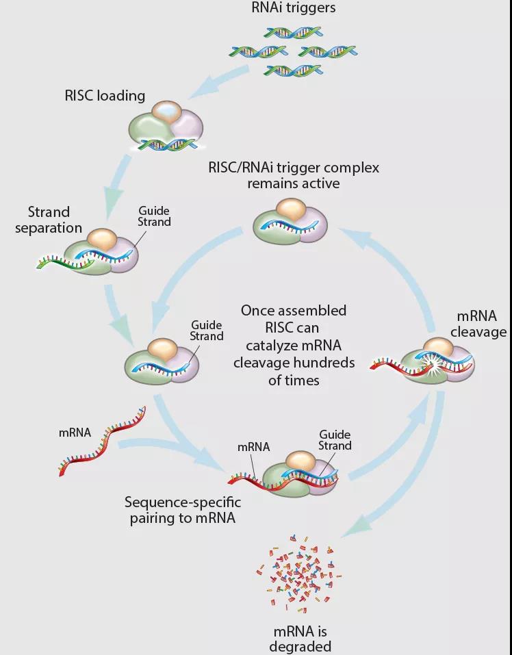 RNAi疗法的作用机制如下图,起初双链RNA(dsRNA)被引入细胞,作为RNAi的触发工具。宿主细胞对这些dsRNA迅速产生反应,通过核酸内切酶Dicer将dsRNA切割为长约21-23bp的RNA片段(siRNA,小干扰RNA),随后siRNA与RNA诱导的沉默复合物(RISC)相结合,并解旋成单链,其中正义链被降解,反义链则诱导RISC与互补的mRNA相结合,并将其降解,从而导致基因沉默,靶蛋白无法合成。RNAi可以被视为一种催化过程,每一个RNAi触发工具可以降解数百次mRNA,从而实现RNAi疗法的长效作用。