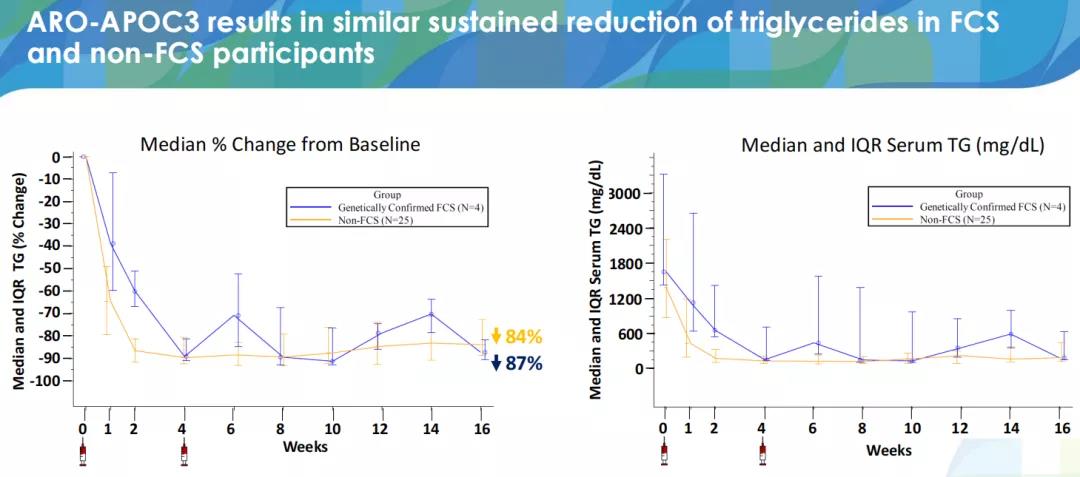 2021年11月,公司在2021美国心脏协会科学年会(AHA2021)上披露了ARO-APOC3在家族性乳糜微粒血症综合征(FCS)和多因素乳糜微粒血症(MCM,非FCS)患者中的临床研究数据(数据截取至2021年3月29日)。数据显示,在FCS与MCM(非FCS)患者中,ARO-APOC3实现了类似的关键脂质参数变化,持续降低甘油三酯(TG)水平、ApoC-III以及非高密度脂蛋白胆固醇(non-HDL-C)水平,并提高了高密度脂蛋白胆固醇(HDL-C)水平,有望实现每3个月或每6个月给药一次。在FCS患者与MCM患者中,ApoC-III水平分别降低了98%和96%;TG水平的最大降幅中位数分别为91%和90%;non-HDL-C水平分别降低了58%和49%;HDL-C水平分别增长152%和111%。