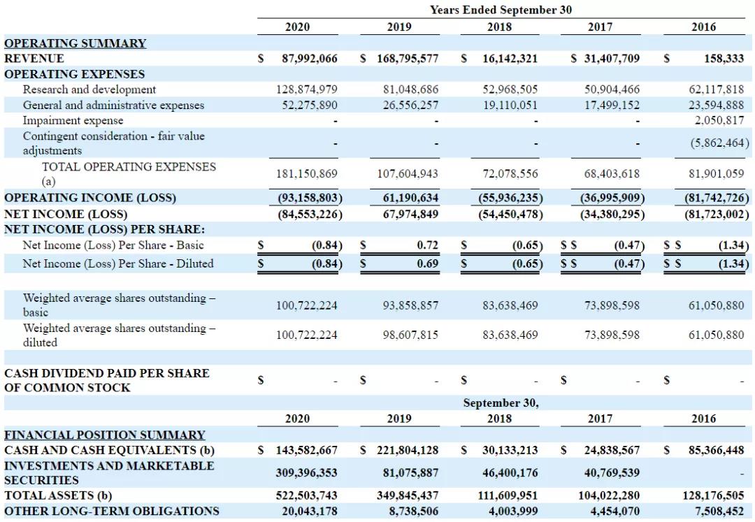 2020年11月23日,Arrowhead公布2020财年财务状况(2019年10月1日至2020年9月30日),公司2020财年总收入8799.2万美元,研发支出为1.288亿美元,一般及行政开支为5227.5万美元。总的来说,公司2020财年净亏损8455.3万美元,截至2020年9月30日,公司的现金和现金等价物共1.4358亿美元,总资产5.225亿美元。