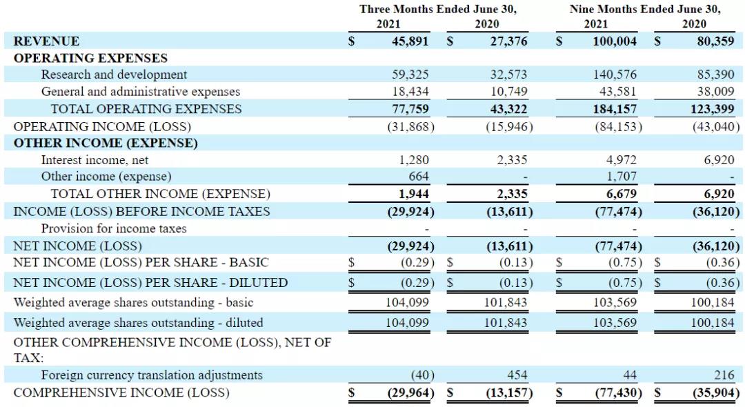 2021年8月5日,Arrowhead公布2021财年前三季度财务状况(2020年10月1日至2021年6月30日),公司2021财年前三季度总收入1美元,研发支出为1.4亿美元,一般及行政开支为4358.1万美元。总的来说,公司2021财年前三季度净亏损8415.3万美元,截至2021年6月30日,公司的现金和现金等价物共3.2598亿美元,总资产7.3493亿美元。