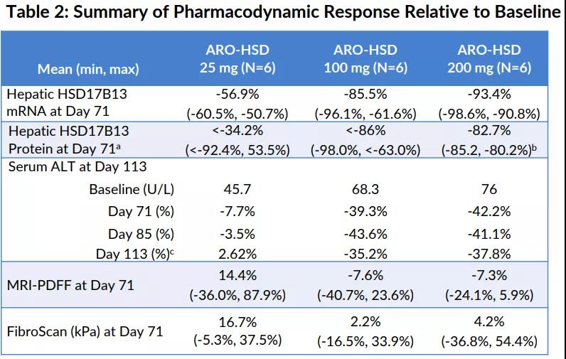 2021年11月,Arrowhead在2021年美国肝病研究学会年会(AASLD2021)上披露了ARO-HSD1/2a期研究的中期数据(数据截取至2021年8月12日)。结果显示,所有患者体内均观察到HSD17B13mRNA的剂量依赖性药效作用。在25mg、100mg、200mg剂量治疗队列中,HSD17B13mRNA分别平均减少了56.9%、85.5%、93.4%;在100mg、200mg剂量治疗队列中观察到血清谷丙转氨酶(ALT)水平显著减少;MRIPDFF检测显示,18例患者中有9例患者肝脏脂肪水平减少4~41%;FibroScan检测显示,18例患者中有6例患者肝脏硬度(kPa)降低4~37%。同时显示出良好的耐受性与安全性。