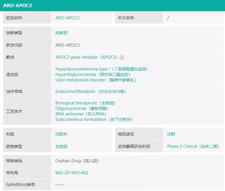 ApoC-III调节富含甘油三酯的脂蛋白(TRL),是一种已知的脂蛋白脂酶(LPL)活性和LPL介导的TRL脂肪分解抑制剂,ApoC-III还通过抑制肝细胞受体介导的摄取来延迟肝脏清除脂蛋白残留,导致血液中甘油三酯(TG)水平和极低密度脂蛋白(VLDL)水平升高、高密度脂蛋白胆固醇(HDL-C)水平降低,因此ApoC-III已成为降低甘油三酯的重要治疗靶点。ARO-APOC3旨在通过减少肝脏ApoC-III的表达,以减少极低密度脂蛋白(VLDL)的合成、加速分解富含甘油三酯的脂蛋白(TRL),更好地清除VLDL以及乳糜微粒残留(CR)。2019年6月,Arrowhead宣布该药已获得FDA授予的孤儿药资格认定,用于治疗家族性乳糜微粒血症综合征(FCS)。