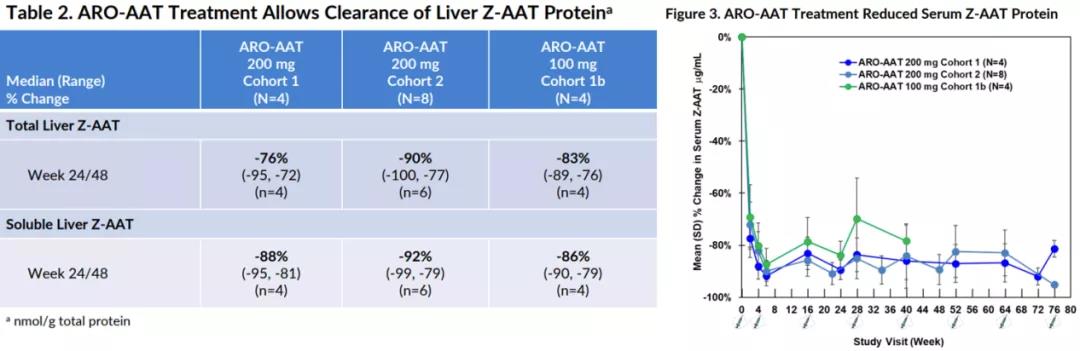 2021年11月,Arrowhead在2021年美国肝病研究学会年会(AASLD2021)上披露了ARO-AAT2期研究的最新数据(数据截取至2021年8月31日)。数据显示,经过ARO-AAT的治疗,患者血清内以及肝脏内Z-AAT蛋白水平显著且持续降低。