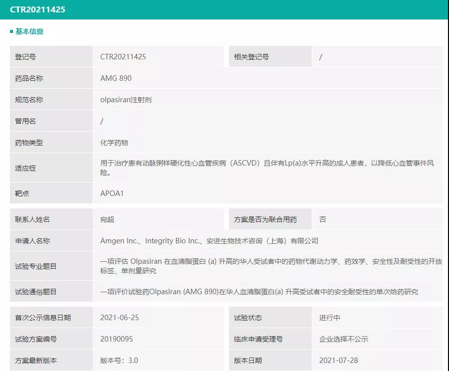 2020年7月,公司开启了一项随机、双盲、安慰剂对照的2期临床试验(NCT04270760),旨在评估Olpasiran(AMG890)在血浆脂蛋白(a)升高患者中的安全性、耐受性与疗效,该试验招募290名受试者,预计只要终点完成时间为2022年1月。