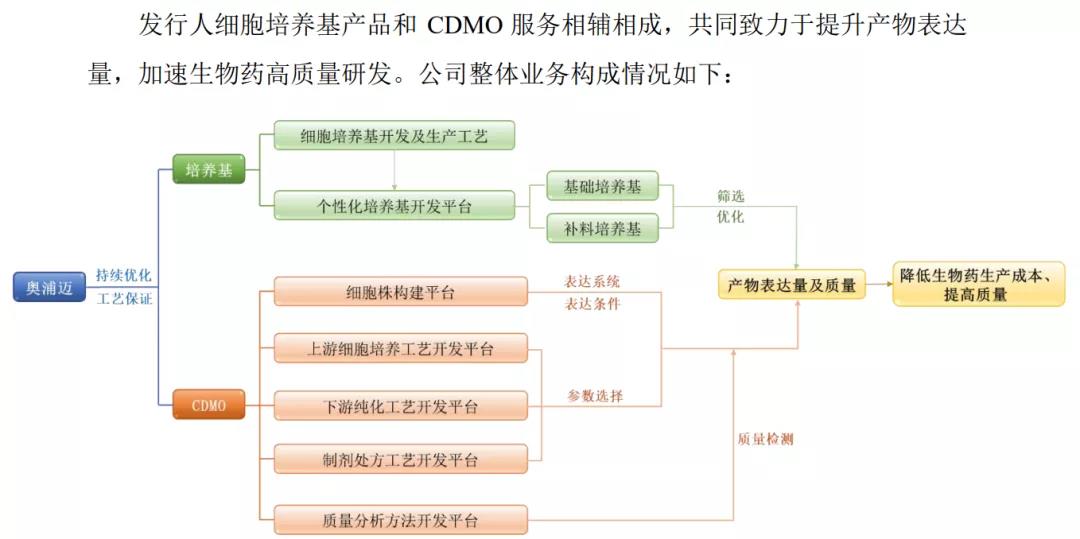 公司采用细胞培养产品技术+服务的整体解决方案,无血清培养基是公司业务的根本与基础。细胞培养基是生物药研发上市全流程中不可或缺的原料之一, 其用量随着生物药的研发和生产呈级数增长。当药物上市后,细胞培养基的需求量将与药物的市场需求量相匹配。CDMO 服务在公司成长和扩张中扮演重要 角色。一方面可在药物早期开发过程中锁定客户,促使潜在客户在临床研究与上市阶段使用公司培养基产品;另一方面在提供 CDMO 服务的过程中使用公司培养基产品,可以降低服务成本,与客户达到双赢。
