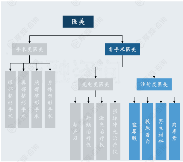 医疗美容是指运用手术、药物、医疗器械等医学技术方法对人的容貌和人体各部位形态进行的修复与再塑。通常将医疗美容分为手术类和非手术类,手术类常见的有重睑手术、外科隆鼻手术、隆胸手术等。非手术类可分为光电类、注射类,光电类主要采用超声、射频、激光、脉冲光等医疗设备作用于皮肤不同层次来美容;而注射类则通过皮下注射玻尿酸、胶原蛋白、再生材料、肉毒素来改善外貌。