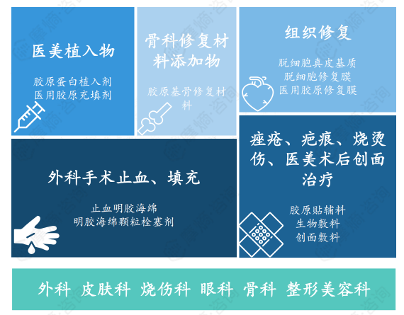 此外,胶原蛋白还被用于组织修复(如脱细胞真皮基质、脱细胞修复膜、医用胶原修复膜),以及外科手术中的止血和填充(如止血明胶海绵、明胶海绵颗粒栓塞剂)。在皮肤科和烧伤科,胶原蛋白敷料(如胶原贴辅料、生物敷料、创面敷料)被用于痤疮、疤痕、烧烫伤以及医美术后创面的治疗,能够有效促进伤口愈合,减少疤痕形成。