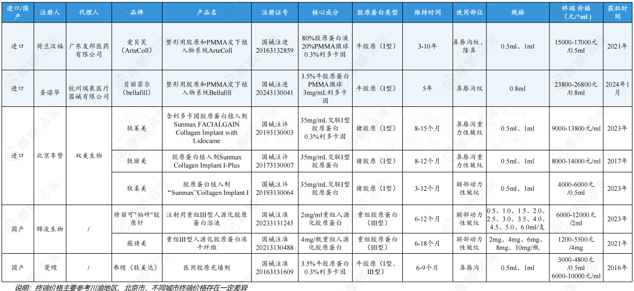 国内获批上市的8款胶原蛋白植入产品,6款成分为动物源,进口产品添加了PMMA价格更高。