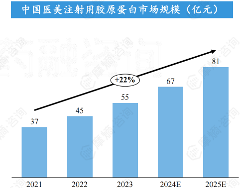 中国医美注射用胶原蛋白市场正处于高速发展的黄金时期。据摩熵医械数据库统计,2023年我国医美注射用胶原蛋白市场规模约为55亿元,近几年将以22%的增速高速增长。