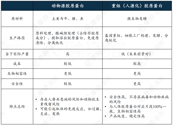 按来源与制备方式,胶原蛋白可分为动物源胶原蛋白与重组人源化胶原蛋白两类。