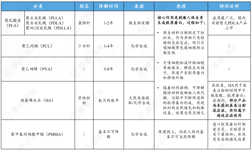 常见的医美注射类再生材料包含聚乳酸(polylactic acid,PLA)、聚己内酯(polycaprolactone,PCL)、聚乙烯醇(polyvinyl alcohol,PVA)、羟基磷灰石( Hydroxyapatite, HA)、聚甲基丙烯酸甲酯(Polymethyl Methacrylate,PMMA)。