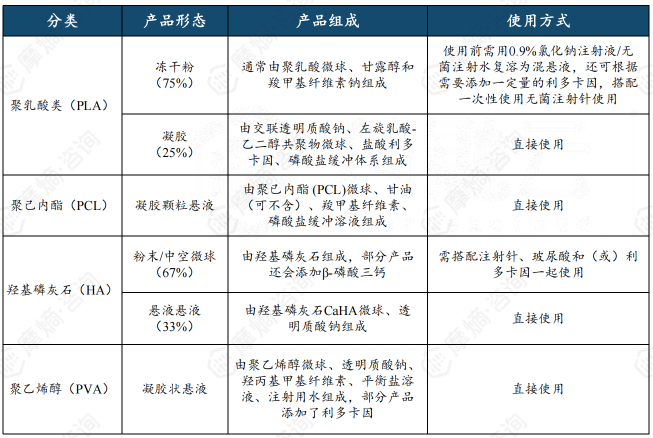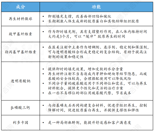 医美注射用再生材料多为凝胶态,大部分产品含有或需搭配玻尿酸使用。在产品组成方面,不同的再生材料有着各自独特的配方,而其中的重点成分决定了产品的核心功能。