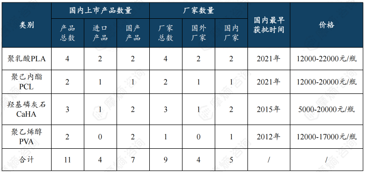 在聚乳酸、聚己内酯、羟基磷灰石、聚乙烯醇四大类型的再生材料中,本土企业有先发优势,比进口产品先上市数年,率先完成市场教育,占领了较大市场份额。与进口产品相比,国产再生材料的定价不像玻尿酸、胶原蛋白那样明显低于进口产品。