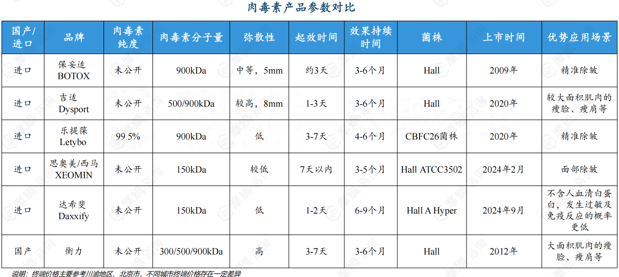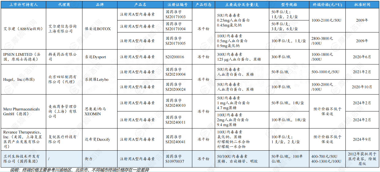 不少老牌药企通过收购、授权等方式积极布局和引入注射类肉毒素产品。国内市场经NMPA批准上市的肉毒素产品共有6款(进口产品占5款),其中有两款为2024年获批上市。各品牌在产品性能、安全性、持久性、价格、终端培训教育等多维度展开激烈竞争,随着更多品牌获得监管批准进入市场、各价格带产品供给丰富、消费者教育提升,市场竞争将进一步加剧。