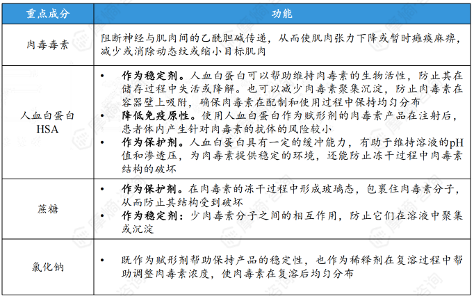 - 人血(清)白蛋白:作为稳定剂,有助于维持肉毒素的活性和稳定性。(详情请看下图)