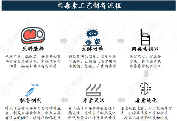 肉毒素的制备包含原料选择、发酵培养、提取、纯化、灭活、制剂制备六个步骤,发酵过程中,要持续监测肉毒素产生情况;分离纯化过程通常涉及粗肉毒素沉淀、凝胶过滤、离子交换等过程。