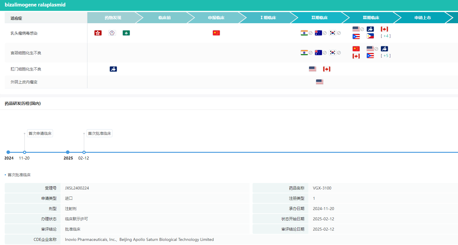 中国最新研发进展:目前,VGX-3100由北京东方略生物(ApolloBio)与美国Inovio制药公司合作,引入中国并推进临床开发。继宫颈癌前病变的III期研究后,VGX-3100于2025年2月获批在中国开展针对HPV-16/18相关阴道癌前病变(VaIN2/3)的II期临床试验。这是VGX-3100继宫颈癌前病变和肛门癌前病变适应症临床研究后的又一重要跨越。
