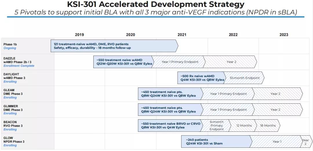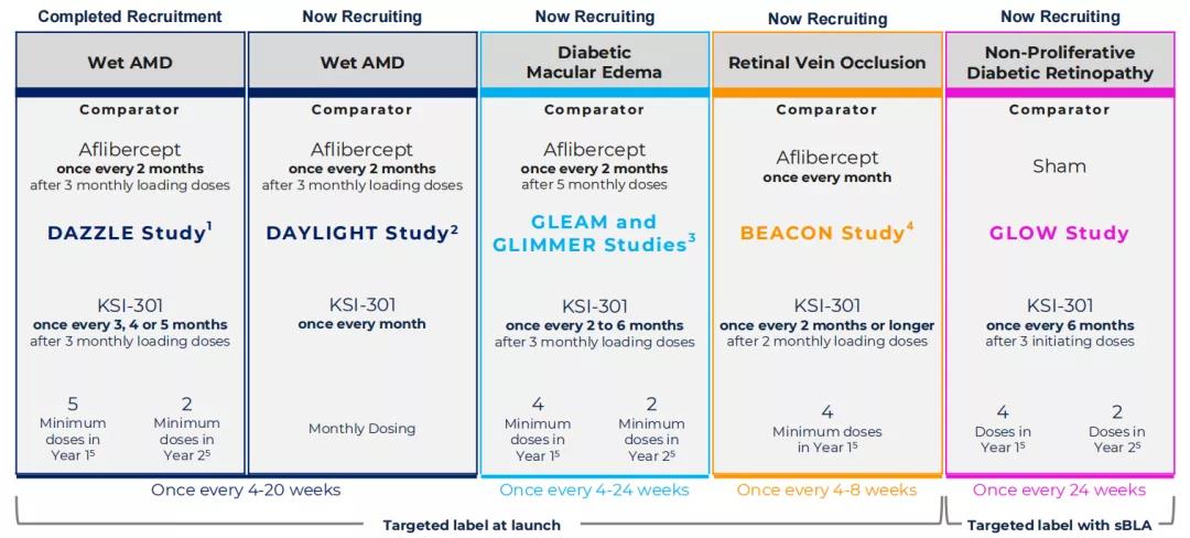 2021年6月15日,该公司还开启了一项名为DAYLIGHT的前瞻性、多中心、随机、双盲、非劣效性3期临床试验(NCT04964089. 3),旨在比较每月注射一次KSI-301与三个月的负荷剂量后每两个月注射一次Aflibercept(阿柏西普)治疗湿性年龄相关性黄斑变性(wAMD)的安全性与疗效。预计主要终点完成时间为2023年3月。