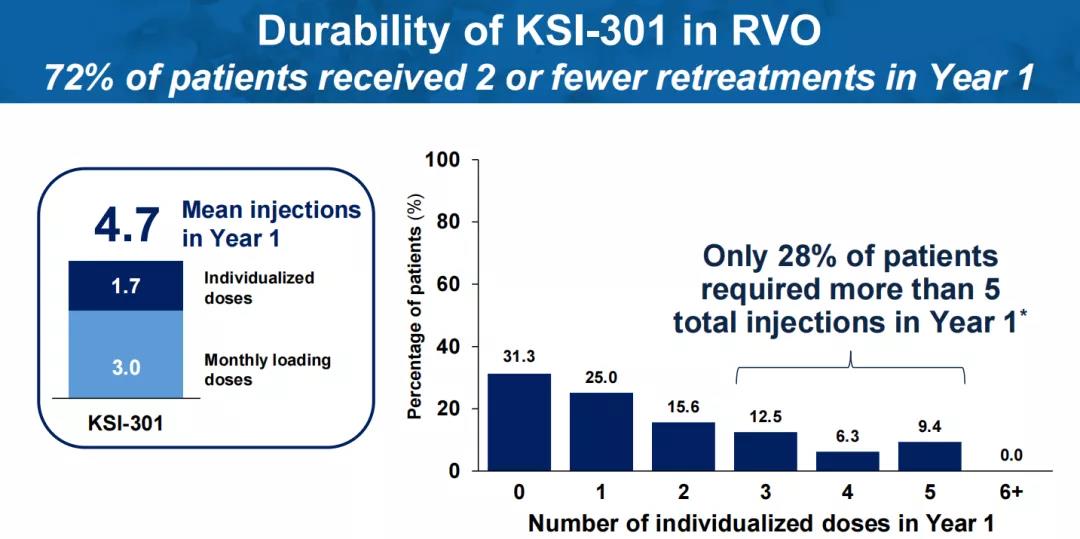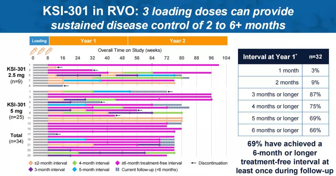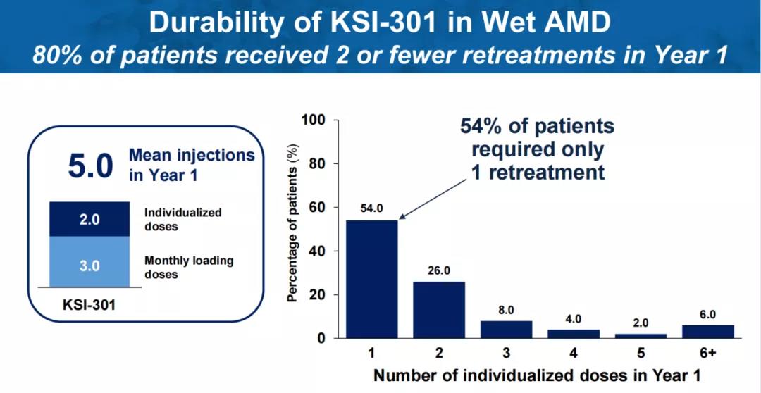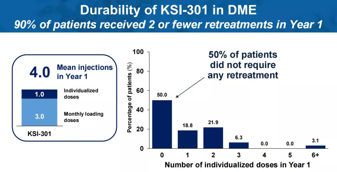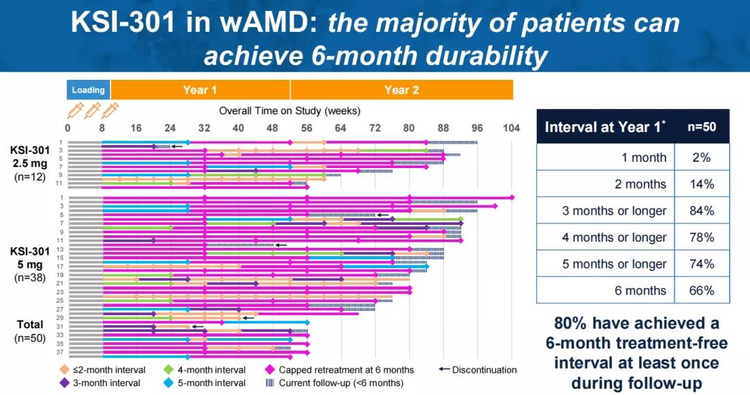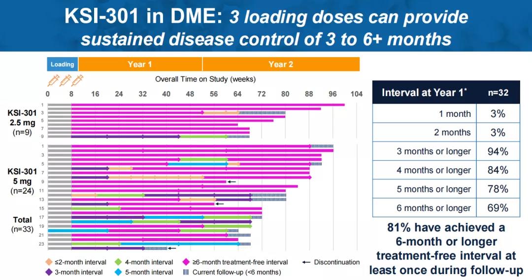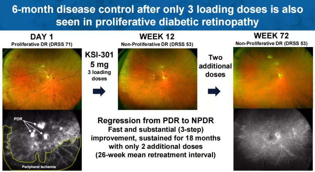 值得一提的是,KSI-301在一例糖尿病视网膜病变(DR)患者身上也实现了6个月的无治疗间隔。在三次负荷剂量后,3个月内,该病例从增殖性糖尿病视网膜病变(PDR)改善为非增殖性糖尿病视网膜病变(NPDR)。再经过2次给药,15个月内仍维持为NPDR。负荷剂量后,平均治疗间隔达到6.5个月。